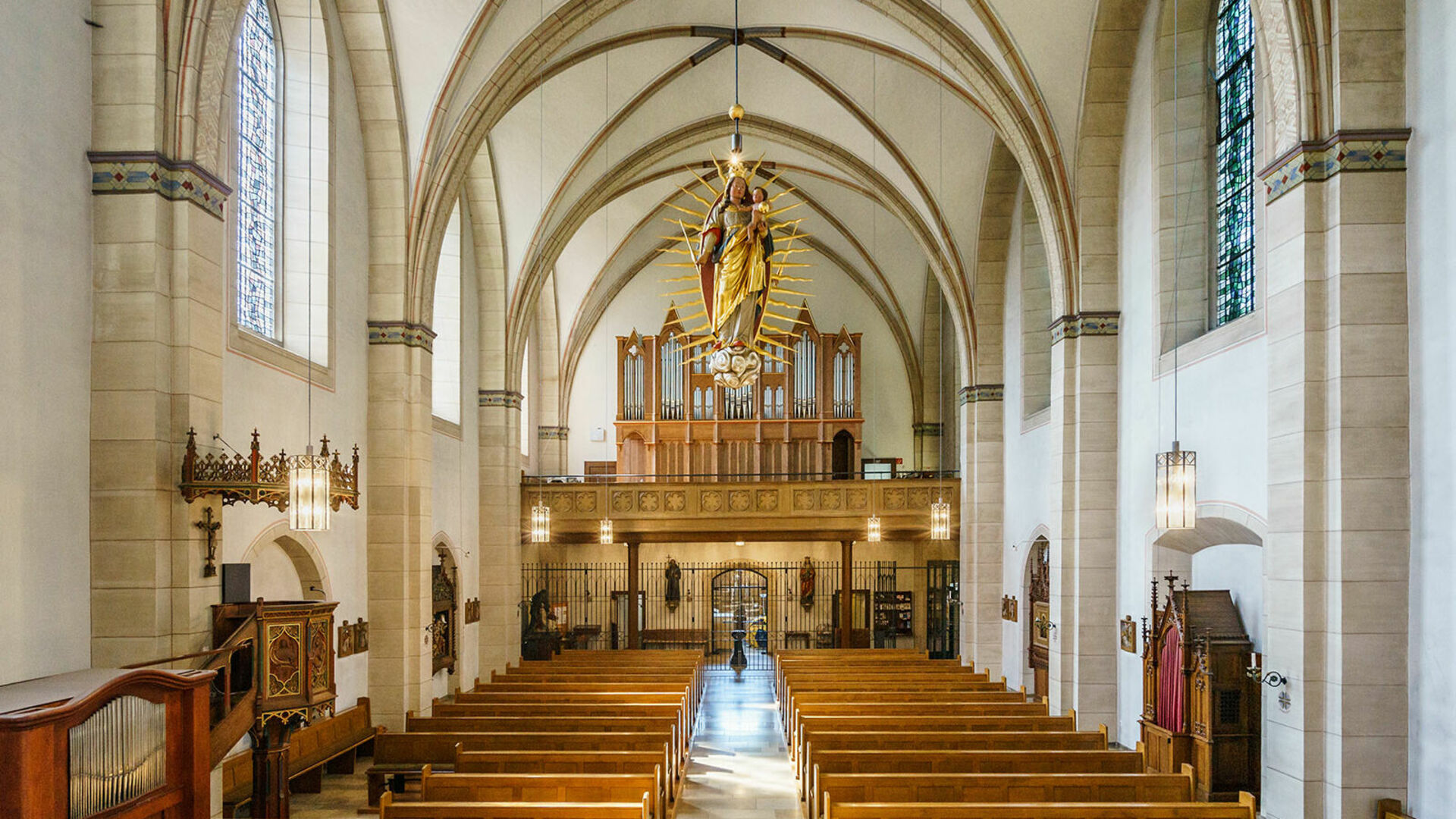 The organ case, which was rebuilt in 2018, and the organ front are based on the historical model, which was manufactured in the neo-Gothic style to match the architecture of the parish church. The organ case houses the 29 stops of the two-manual organ with a total of around 2,000 organ pipes. The entire playing system functions purely mechanically in accordance with the historical model.