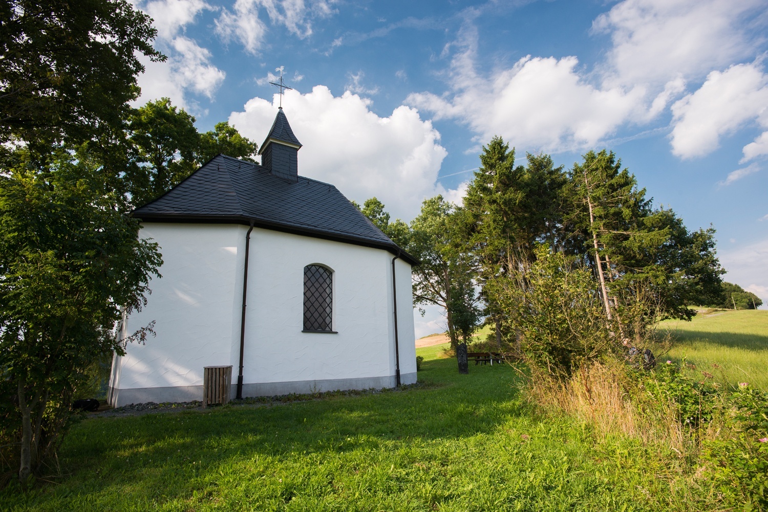 Dann geht es auch schon wieder bergab, zumindest fürs Erste; Durch eine Senke, dann noch eimal ordentlich bergauf, beginnst du schließlich mit dem Endspurt. Vorbei an der Kreuzkapelle auf dem Steimel findest du dich bald an einem Ausgangspunkt in Kirchrarbach.