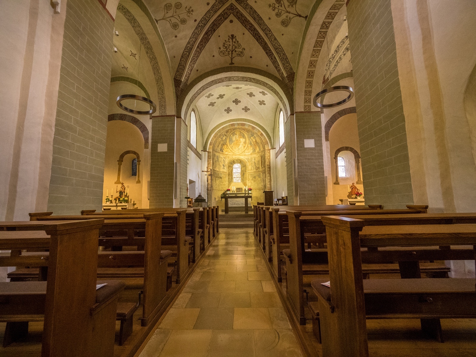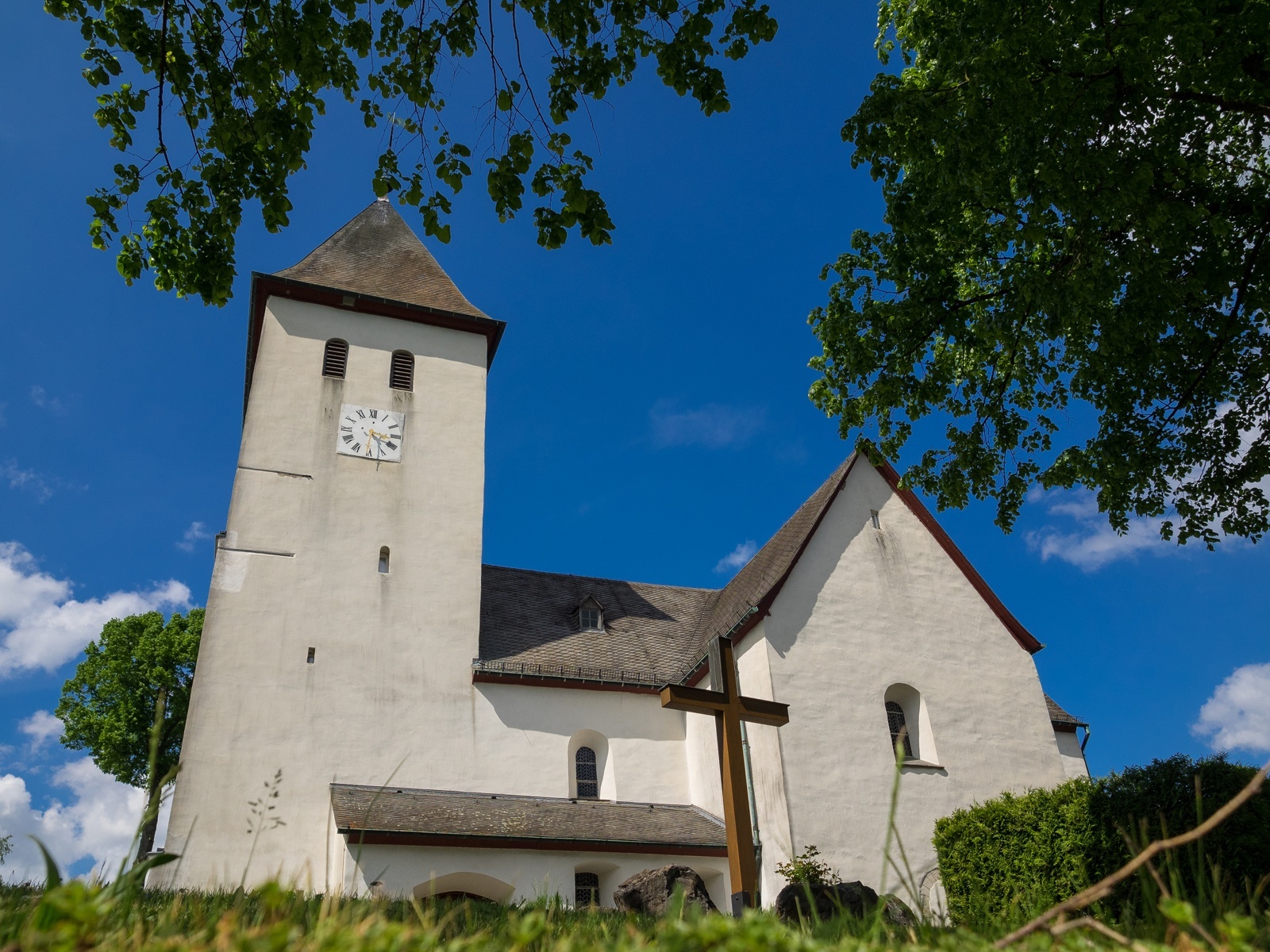 Besuchen Sie die um 1220 als romanische dreischiffige Kreuzbasilika erbaute St. Cyriakus Pfarrkirche in Berghausen.