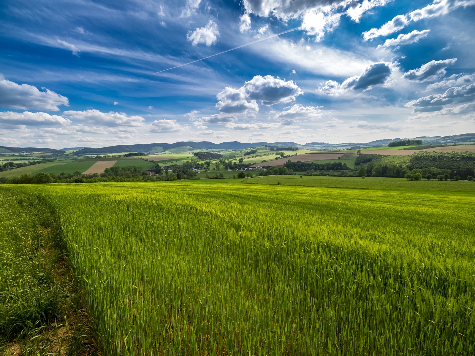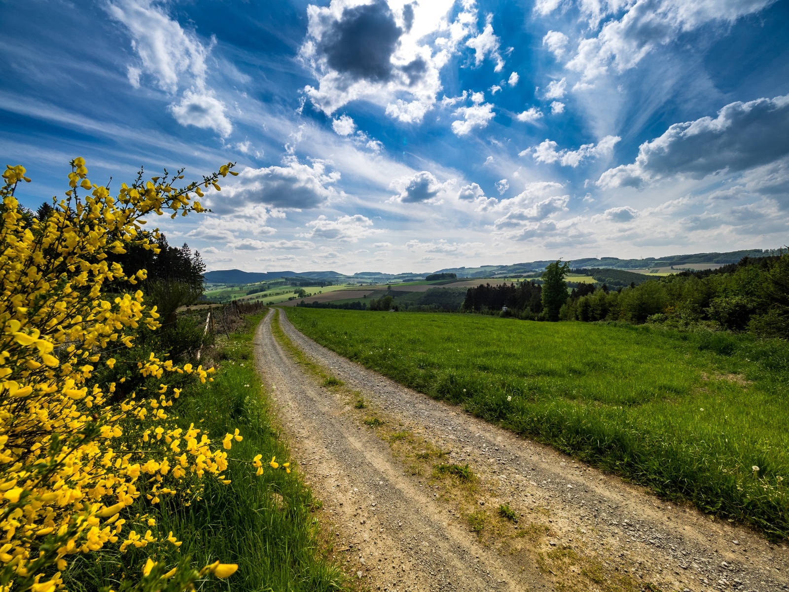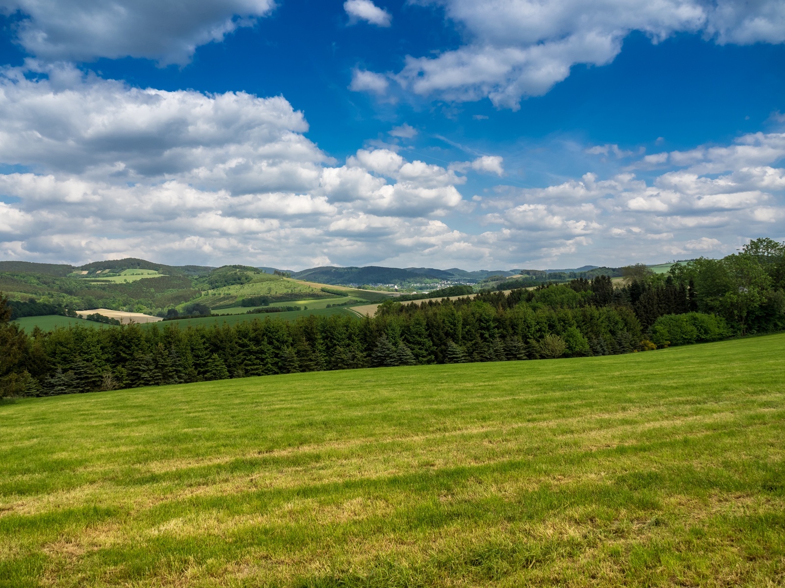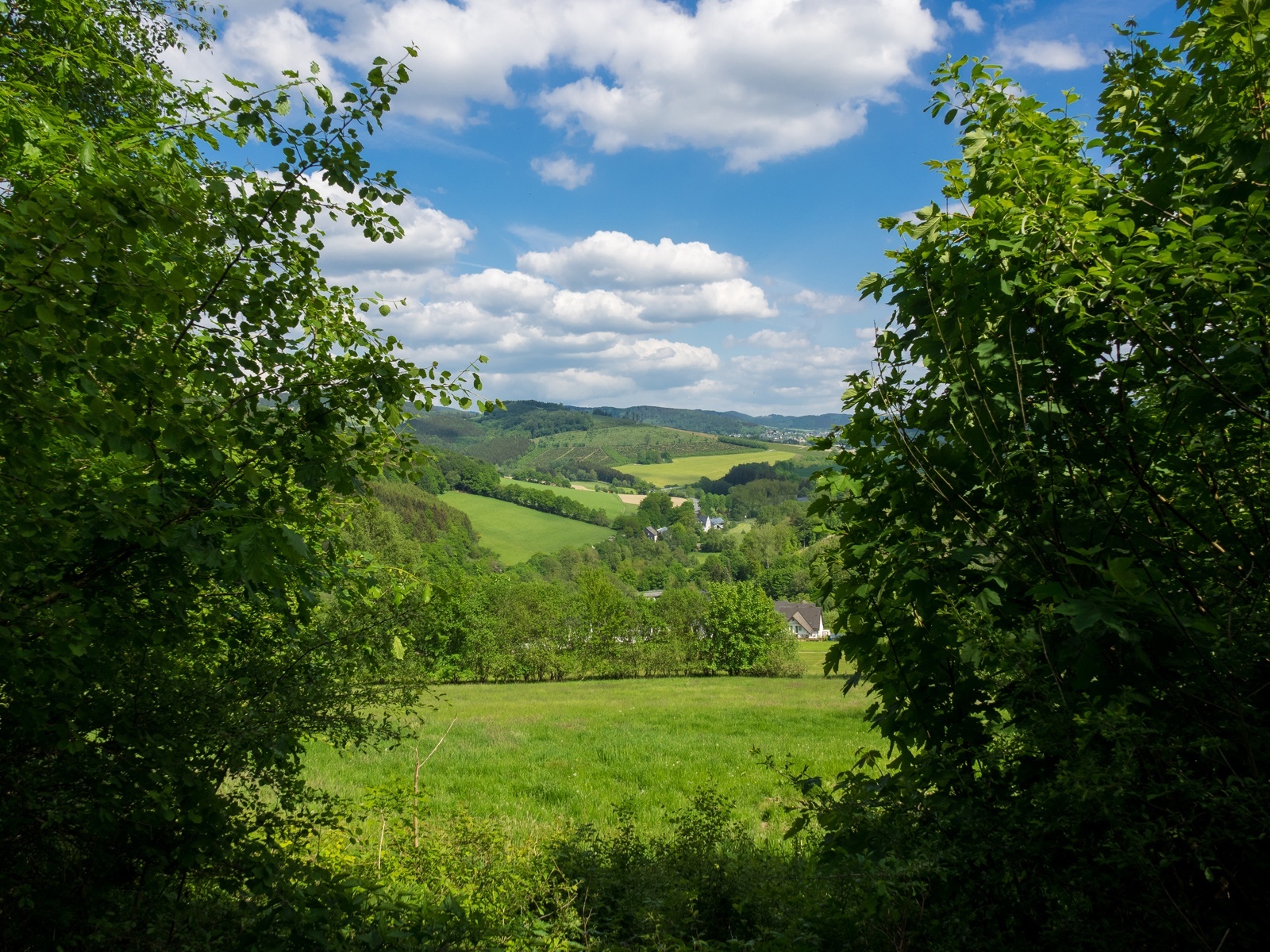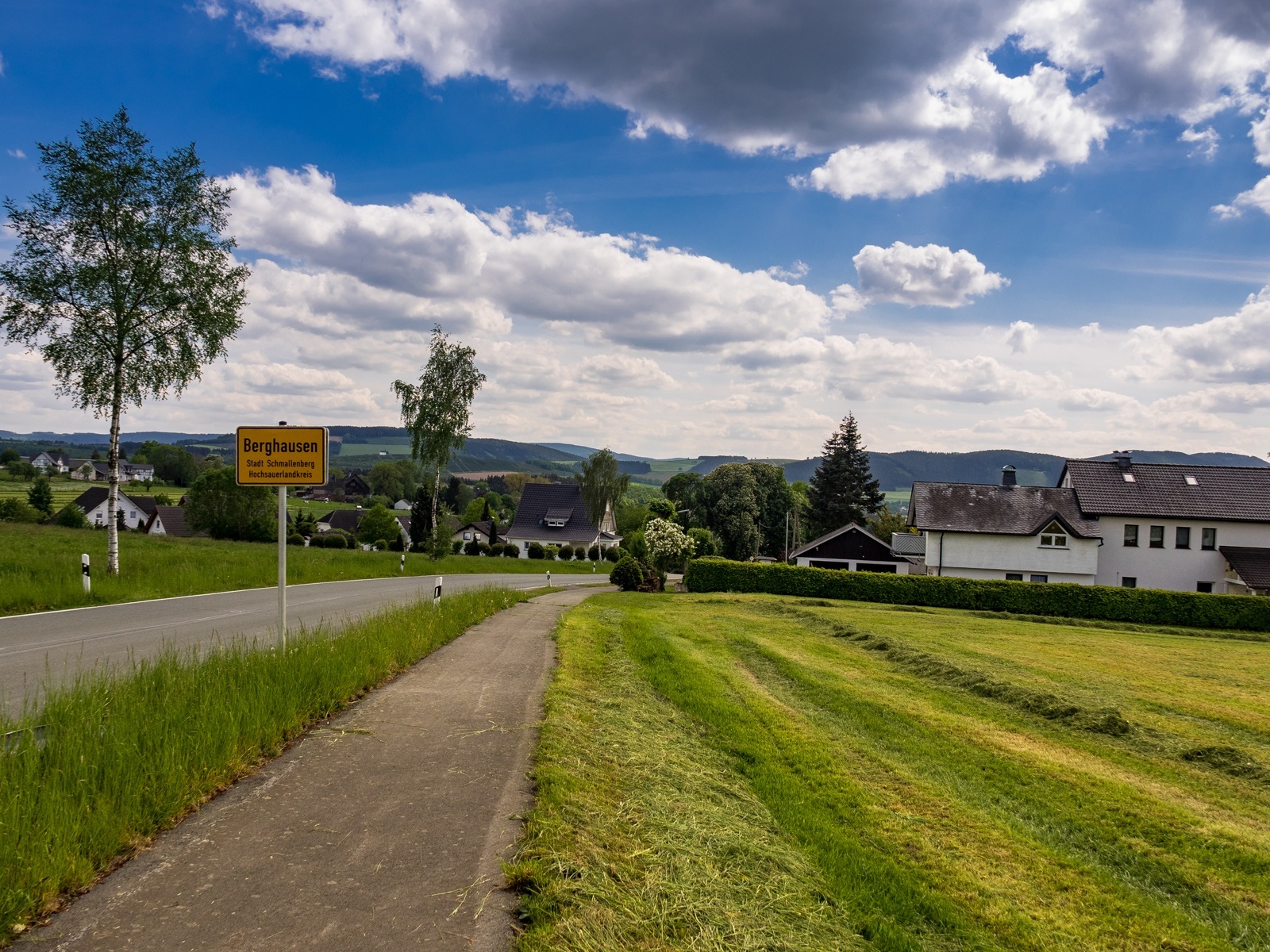 Dort gehen wir rechts runter in Richtung Berghausen und haben bald Aussicht auf das Hawerland. Am Ende des Weges biegen wir links ab und halten uns am nächsten Abzweig rechts, bergab in Richtung Kreisstraße. Wir bleiben auf dem geteerten Weg, bis wir die Kreisstraße erreichen. Dort wenden wir uns links, passieren den Gasthof Heimkehof (Einkehrmöglichkeit) und die Schützenhalle und erreichen unseren Ausgangspunkt.
