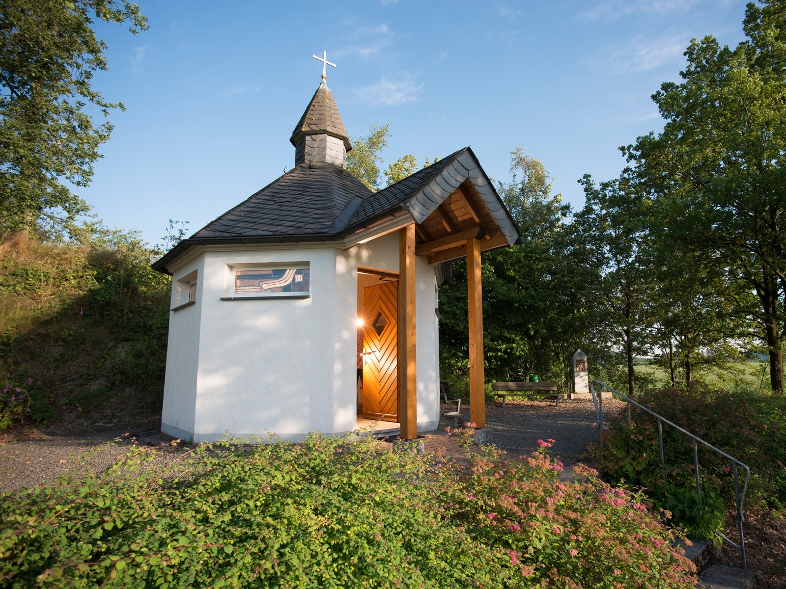 Phantastische Aussichten und Sehenswürdigkeiten säumen die Golddorf-Route, die an der Friedenseiche im Bundesgolddorf Oberhenneborn beginnt und durchgehend mit einem goldenen G auf rotem Grund markiert ist. Auf der Strecke parallel zum Ruttenberg überqueren Wanderer das Flüsschen Sachmecke und erreichen alsbald einen Felsen – die „Henneborner Loreley“. Zwischen zwei Riesen-Fichten hindurch führt die Tour talabwärts zur SGV-Hütte Oberhenneborn - und dann steil bergan. Jeder Schritt lohnt sich, denn oben eröffnet sich ein fantastischer Blick über das Hennetal! An einem Bildstock vorbei ziehen die Wanderer dann um den Heyer Knochen herum bis zur Kreuz-Kapelle und kehren schließlich auf dem Bienen-Lehrpfad nach Oberhenneborn zurück.