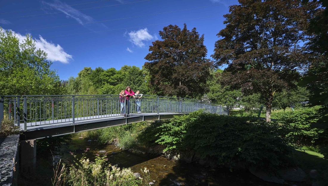 Unser Wanderweg biegt nach links ab und führt uns am Nordwesthang des Aberges allmählich bergab ins Lennetal. Bald hat man einen schönen Blick auf die Schmallenberger Altstadt. Schließlich wird das Lennetal erreicht, und der Aberg-Weg folgt ein kurzes Stück dem Lenne-Weg, der das kleine Flüsschen von der Quelle bis zu seiner Mündung begleitet. Über die Brücke sind es von hier aus über den X27 nur 300 m bis zur Schmallenberger Kirche und somit bis zur Stadtmitte.