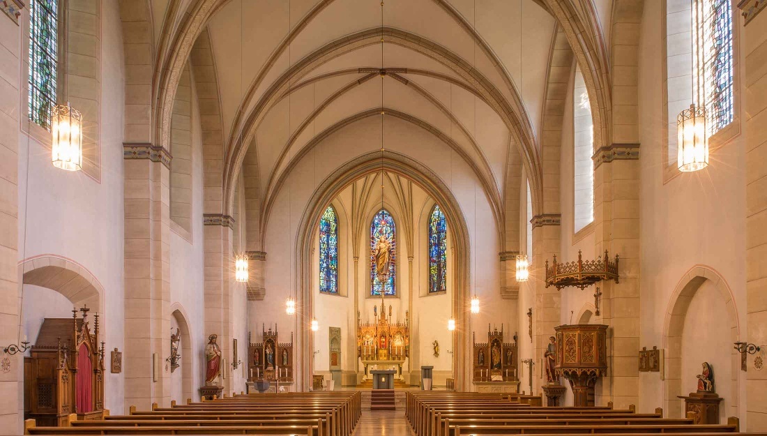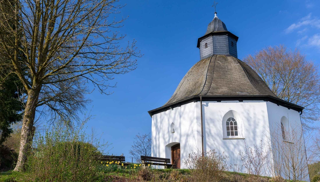 Wandern Sie nun ein Stück oberhalb von Nichtinghausen auf halber Höhe über dem Ort entlang. Sie treffen auf den Ortswanderweg Re1 und folgen Sie diesem über die Bergkuppe in Richtung Erflinghausen. Auf dem alten Totenweg wandern Sie langsam hinab nach Erflinghausen, wo Sie mitten im Ort zu der sechseckigen St. Lucia Kapelle kommen.