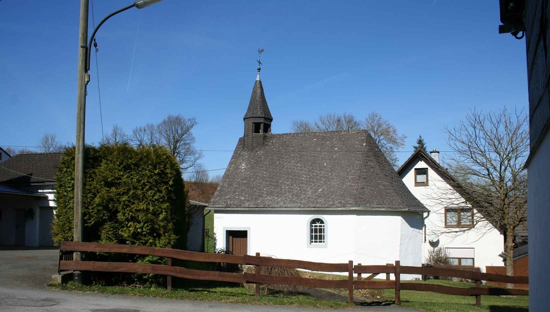 Ein Stück hinter der Kapelle teilt sich der Kapellenweg auf. Ab hier können Sie die Schleife über Sögtrop gehen. Laufen Sie die Strasse durch den Ort über den Hennebach. Nach dem Dorf gehen Sie den Berg in Richtung Sögtrop hinauf. Wandern Sie weiter auf der Schleife des Kapellenweges durch den Wald, bis hinab ins Rarbachtal nach Sögtrop. Dort erreichen Sie die St. Blasius Kapelle.