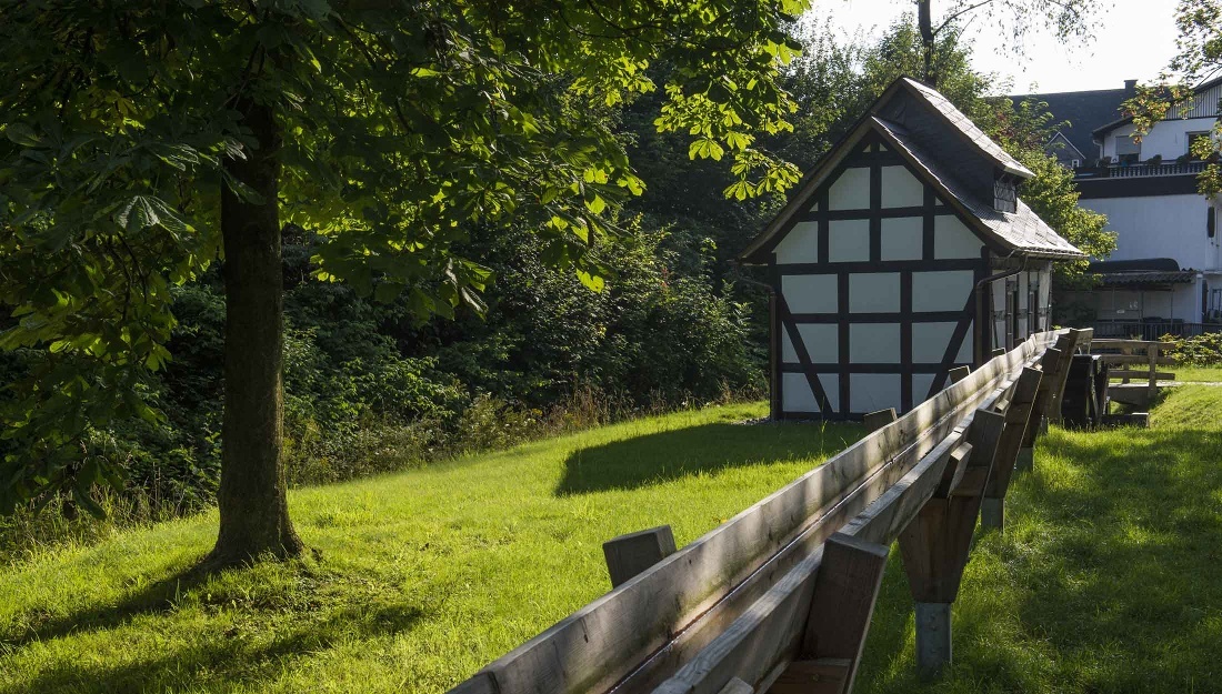 Wir folgen der Hauptstraße in Richtung Oberkirchen. Schon nach etwa 200 m Wegstrecke verläuft die „Grafschaft“ unmittelbar unterhalb der Straße, so dass man den Bach gut im Visier hat. Den besten Blick auf den Bach hat man von der Brücke aus. Hier überqueren wir die Straße und folgen ein kurzes Stück der Straße „An der Almert".