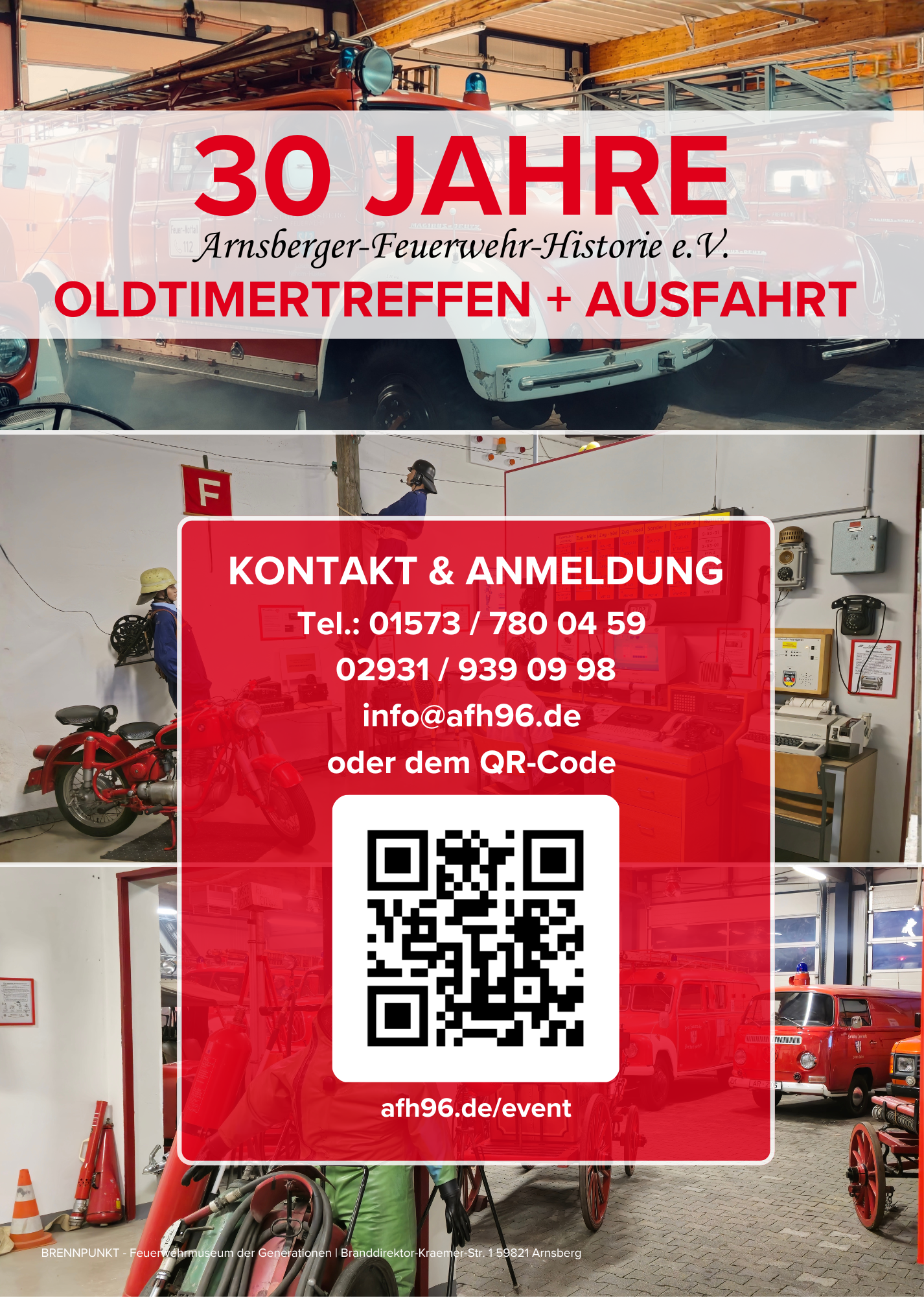 Die Arnsberger-Feuerwehr-Historie e.V. feiert am 01. und 02. Mai 2026 sein 30-jähriges Bestehen. Besucherinnen und Besucher erwartet eine eindrucksvolle Zeitreise durch die Geschichte der Feuerwehr mit historischen Einsatzfahrzeugen, Technik zum Anfassen und einem abwechslungsreichen Rahmenprogramm für die ganze Familie am BRENNPUNKT - Feuerwehrmuseum der Generationen.
