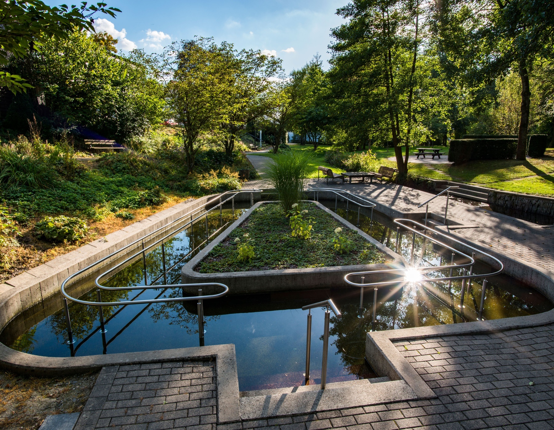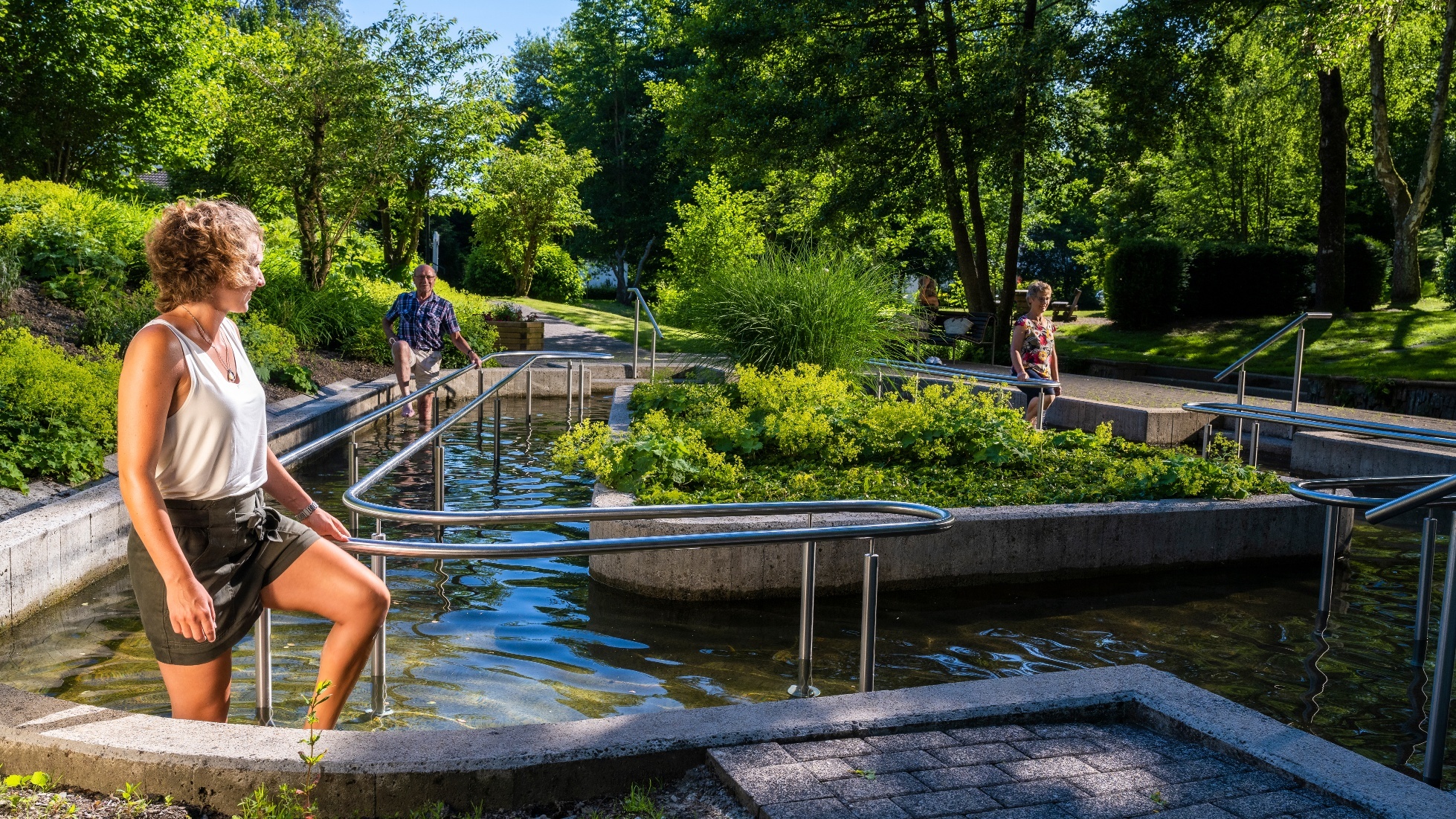 Auf dem weiteren Weg durch den Park kommen Sie zum Wassertret- und Armbecken, wo Sie die wohltuende Wirkung des Wassers erfahren können. An der Säule Heilpflanzen sind 16 Kräuter dargestellt, die Sie im Park finden können und an deren Standorten die Eigenschaften und Anwendungsmöglichkeiten erklärt werden.