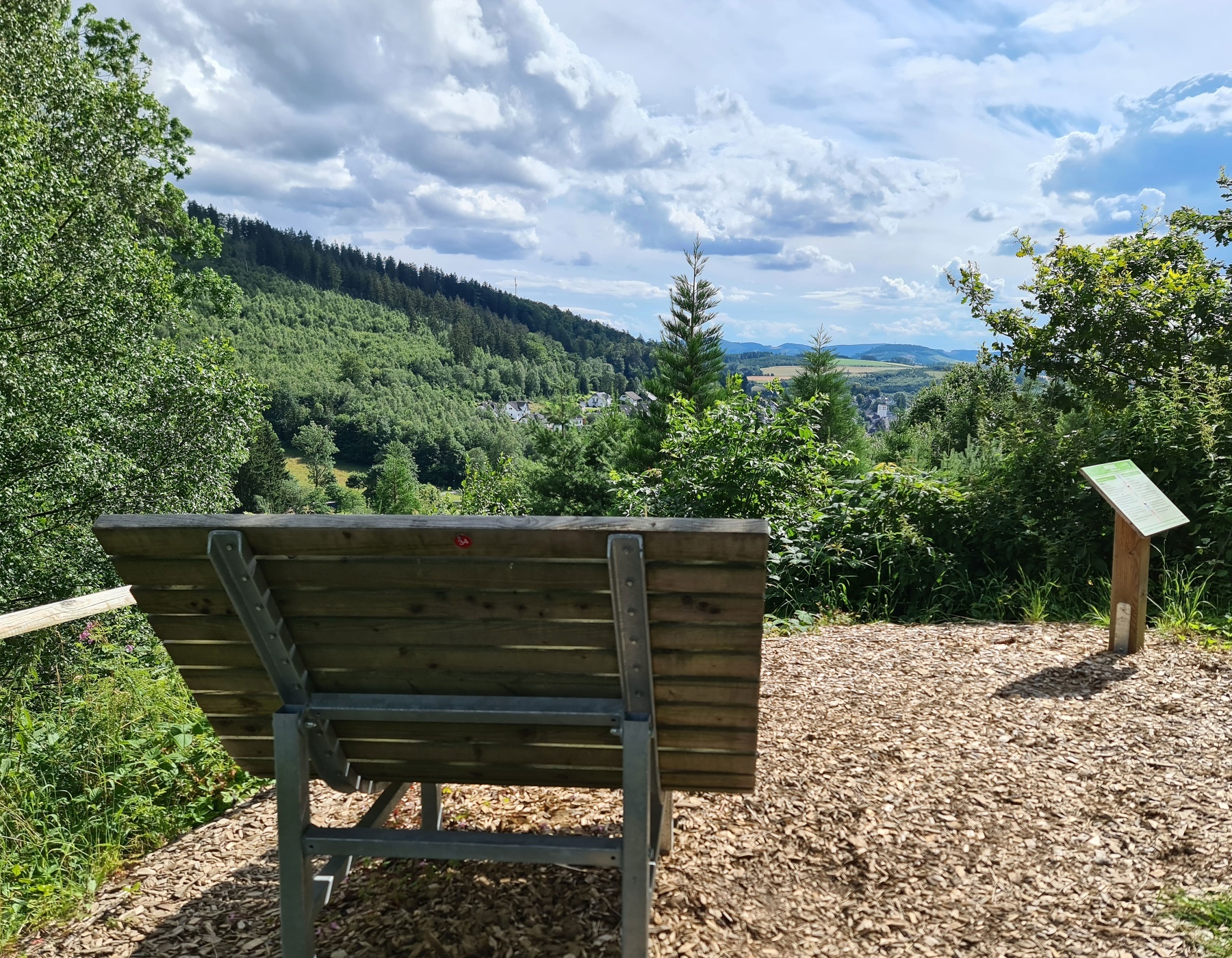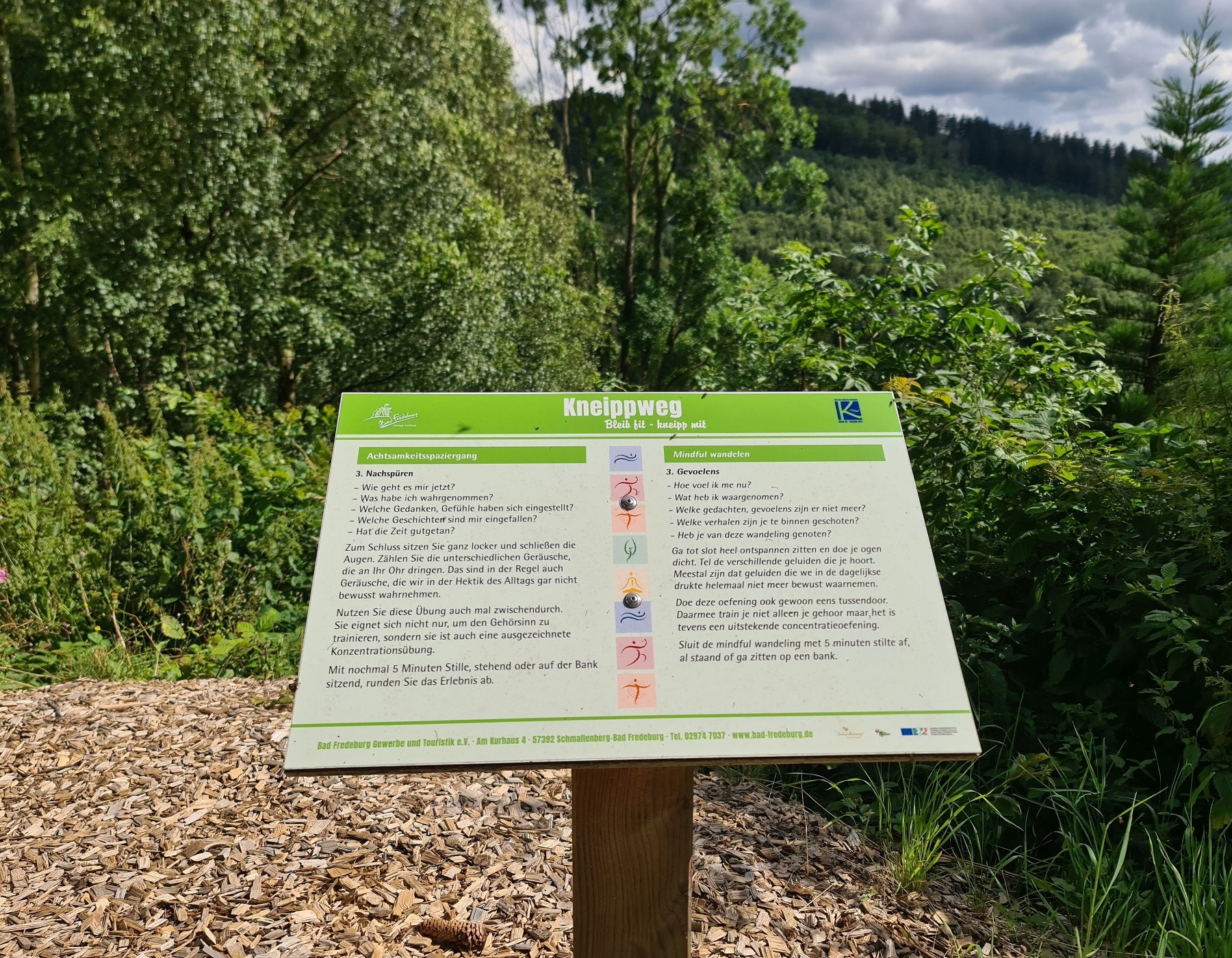 Am Ende des Parks gehen Sie geradeaus weiter und kommen in einen Wald. Bald erreichen Sie die Gesundheitssäule Balance. Hier wird Ihnen der Achtsamkeitsspaziergang vorgestellt. Nach 10 - 15 Minuten, die möglichst in aller Stille gegangen werden und in der Sie Ihre Sinne testen können, erreichen Sie eine Ruhebank mit schöner Aussicht auf Bad Fredeburg und Umgebung. Nun verfolgen Sie den Weg weiter und kommen zur letzten Säule Bewegung. Das  Wegezeichen des Kneippweges führt nach rechts, um nach wenigen Metern links am Hotel zum Hallenberg vorbei die Straße "Am Hallenberg" abwärtszugehen. Am Weg lädt eine Schaukel- und eine Liegebank ein, die schöne Aussicht zu genießen. Weiter abwärts gehend wird die "Hochstraße" erreicht und vorbei an schönen Fachwerkhäusern führt der Weg zurück zum Ausgangspunkt am Kneippbrunnen.