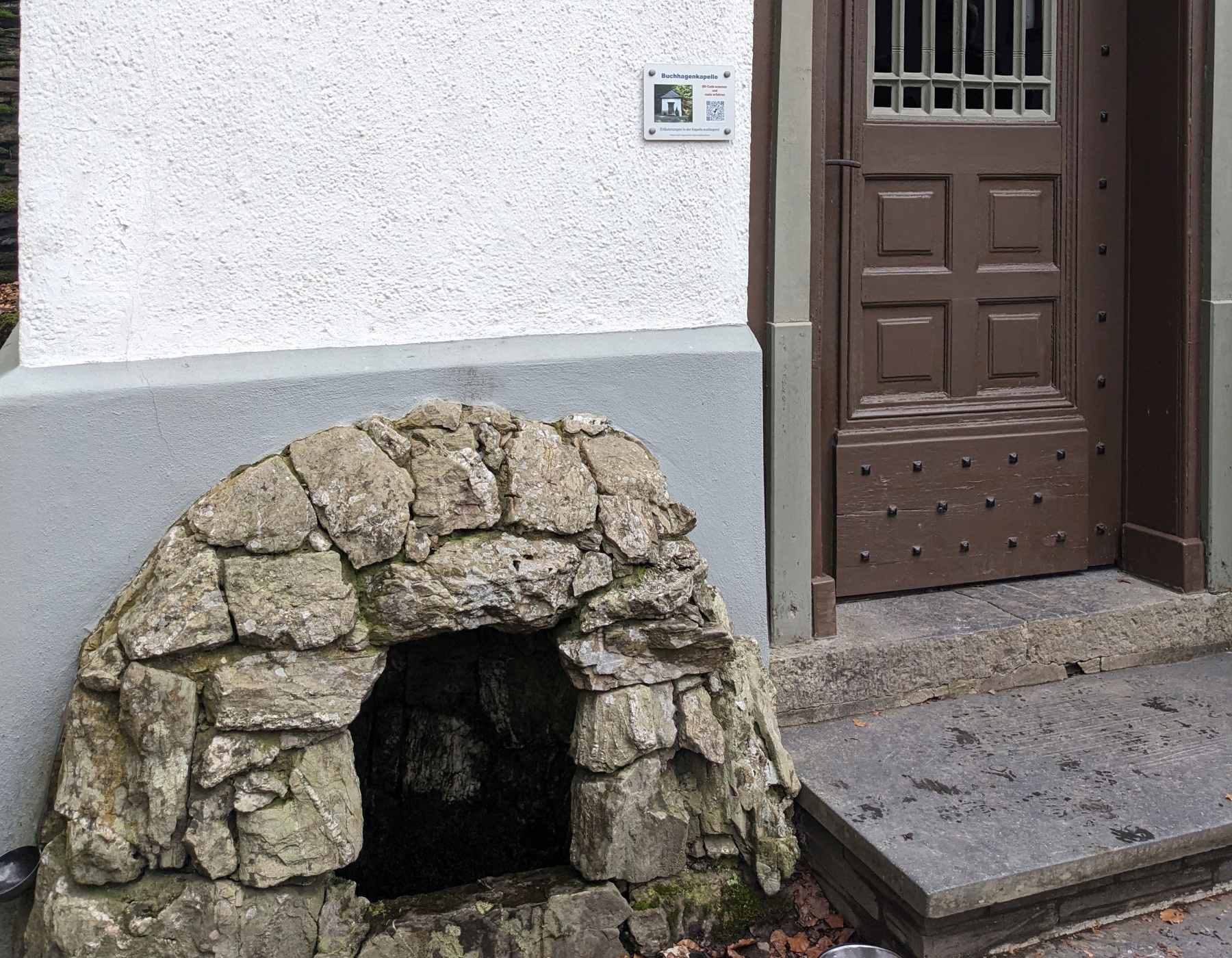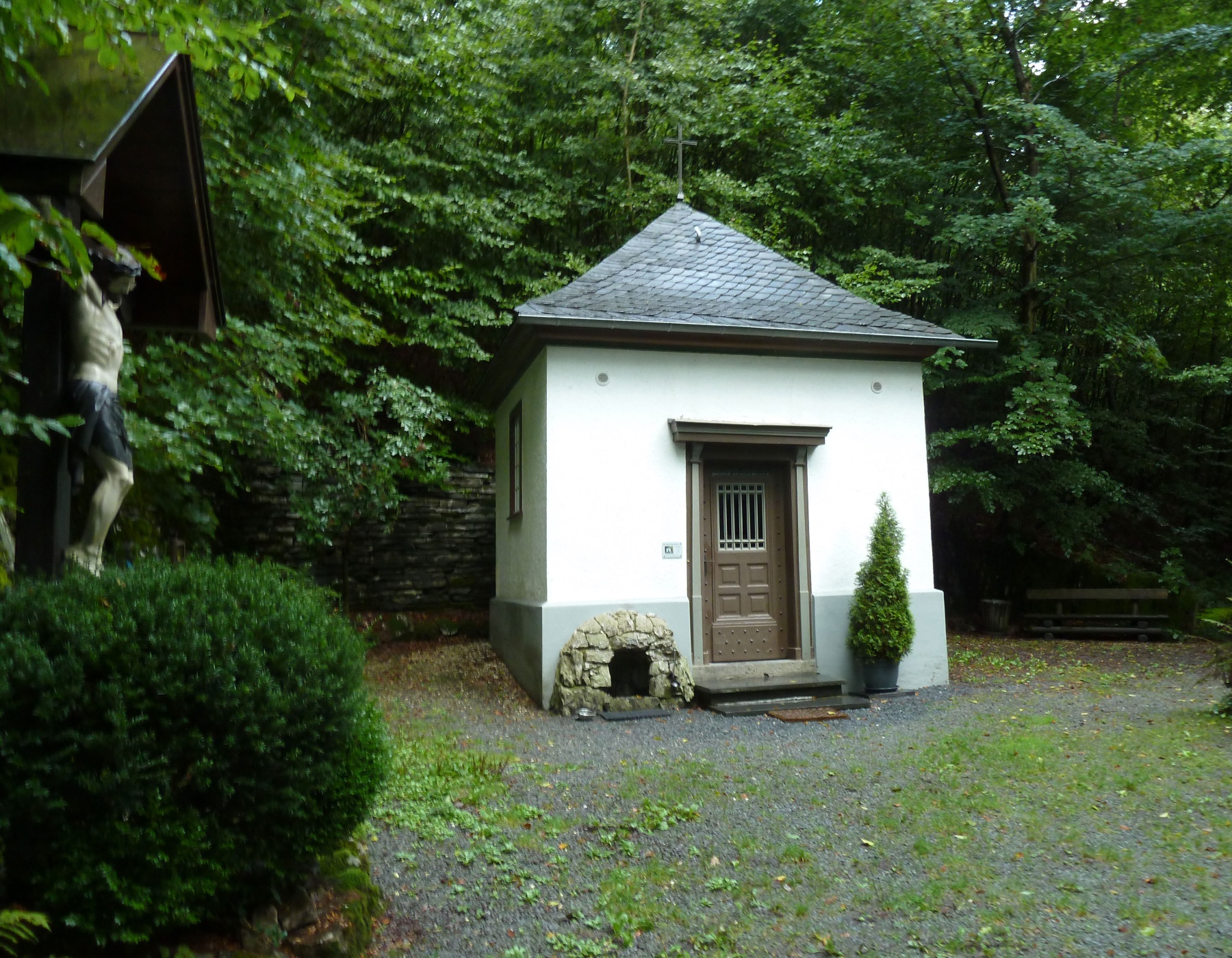 Am Tretbecken Kalte Schlade macht der Weg eine 180 °-Kehre nach links. Nach 200 m auf der asphaltierten Straße an der Kreuzwegstation VI rechts gehen und weiter dem Wanderzeichen A 4 an den Kreuzwegstationen vorbei steil ansteigend folgen bis zur Buchhagenkapelle.